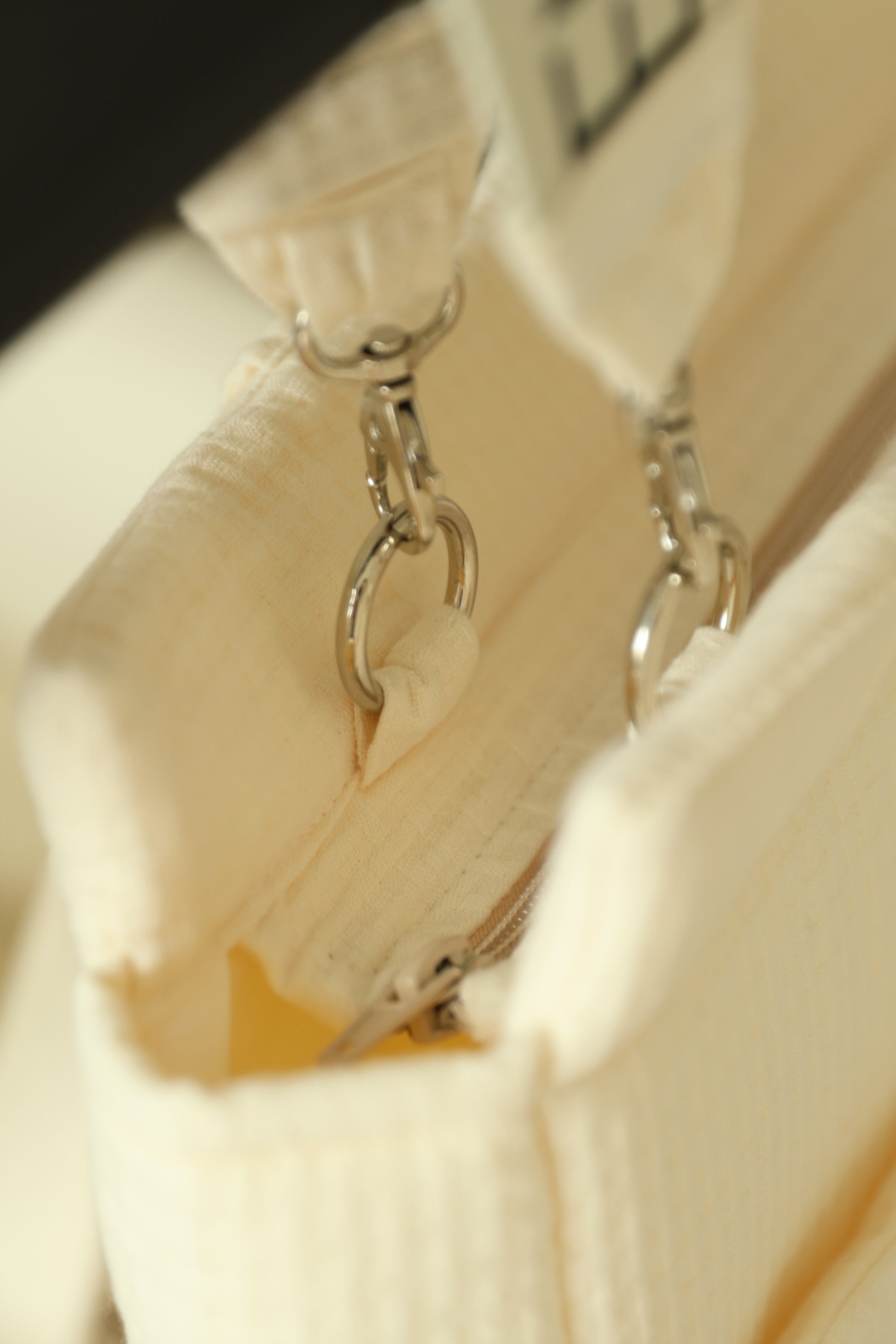 Anillas con mosquetón de quita y pon para poner en la barra del carro. Esto nos permite que cuando queramos llevar la mochila con las asas a la espalda, podamos quitar las asas de soporte de carro; así tener un diseño limpio y polivalente.