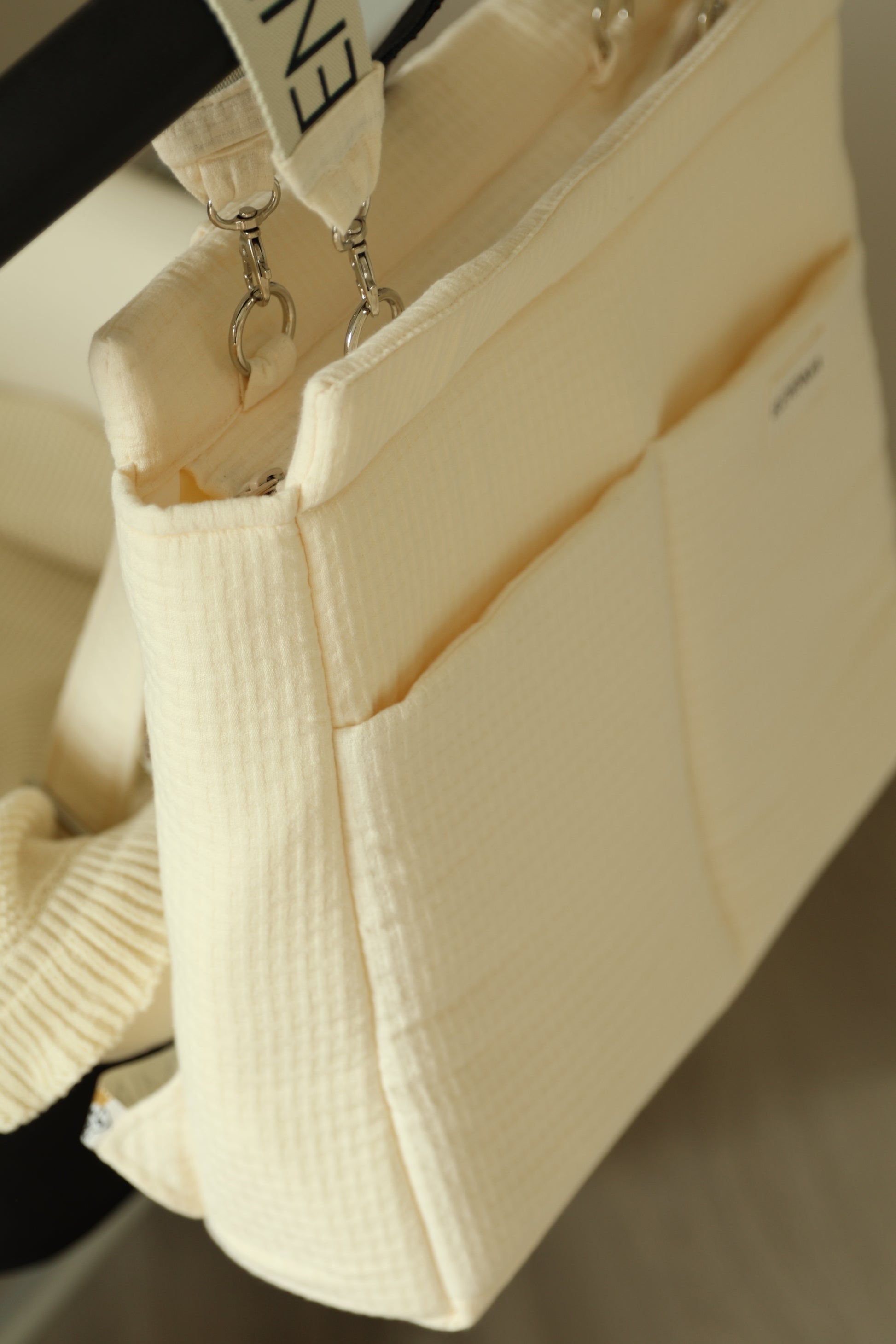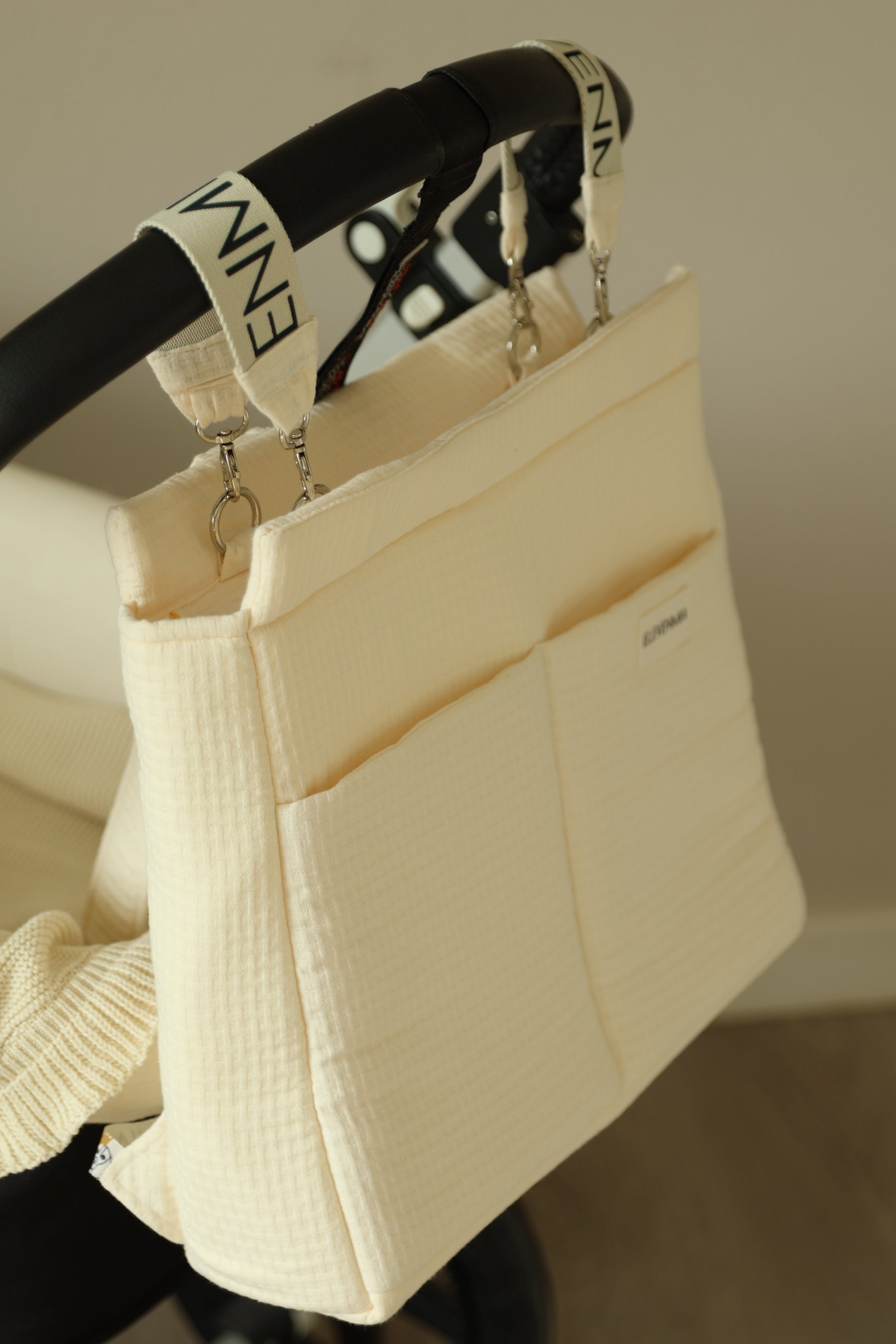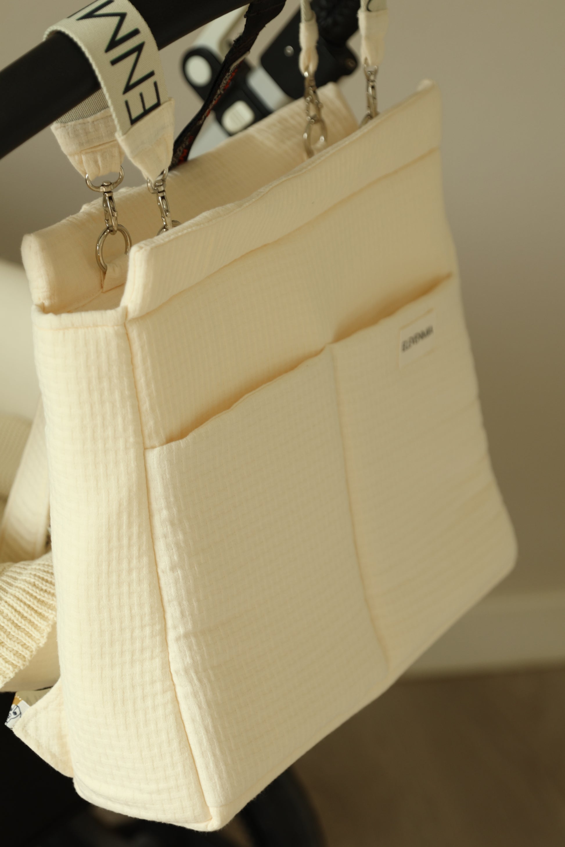 Según vuestras peticiones salió a la luz nuestro nuevo diseño de bolso de cochecito. Una fusión entre las necesidades de un bolso con amplitud y departamentos, con una mochila práctica y funcional.