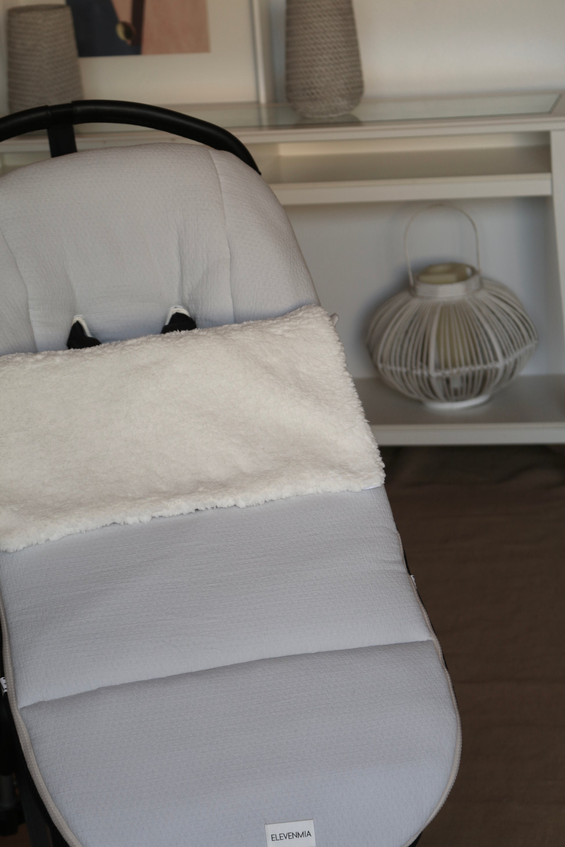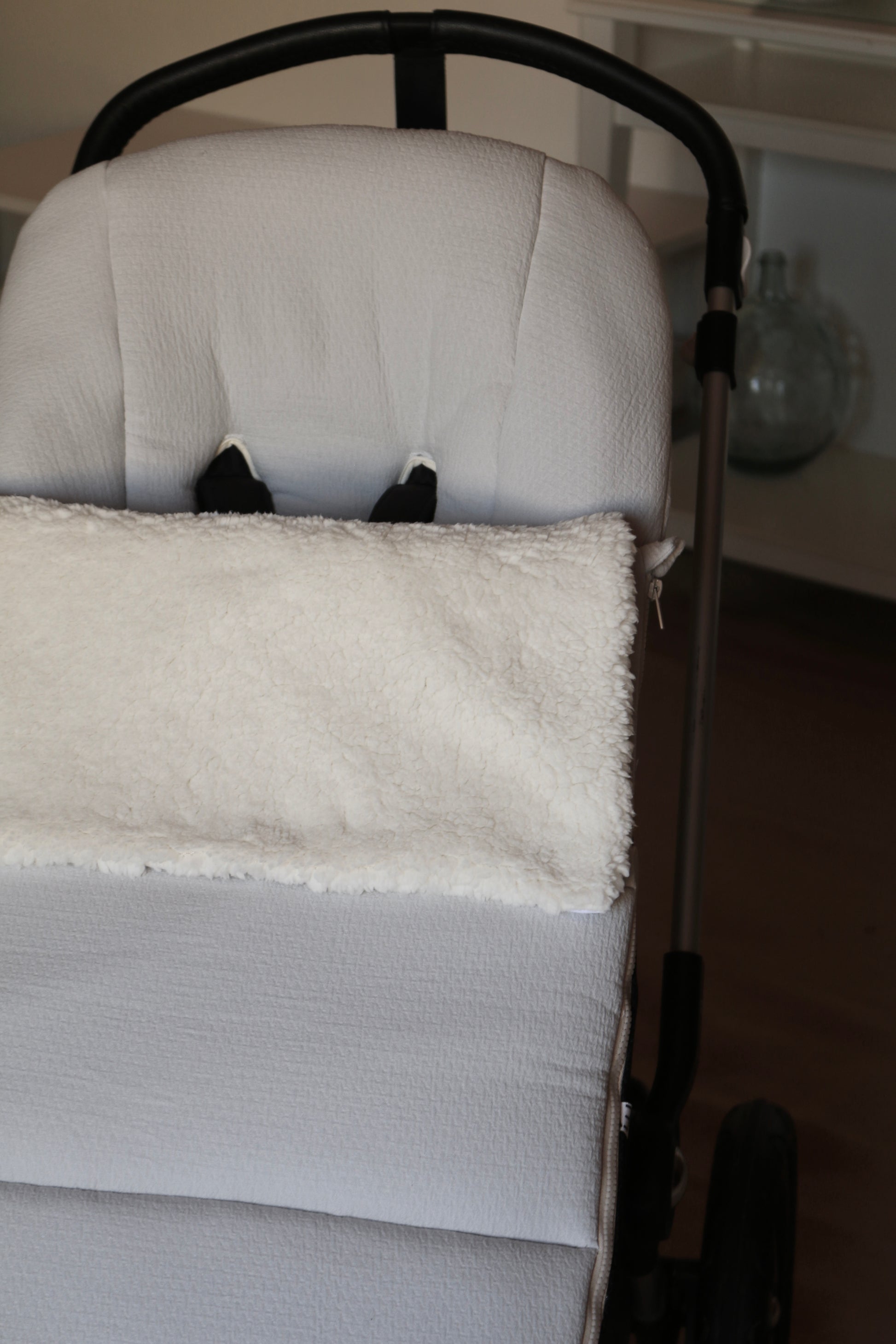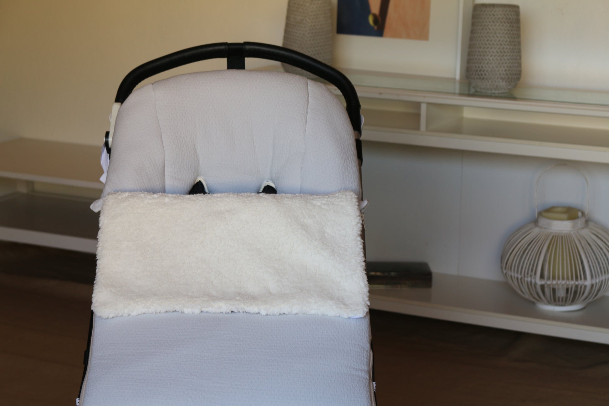 Rabat et sangles pour ajustement à l'arrière de la poussette et réglage au niveau des pieds.