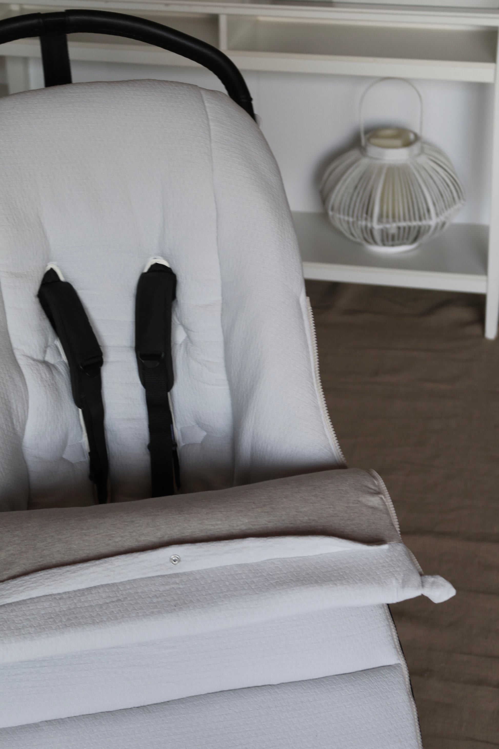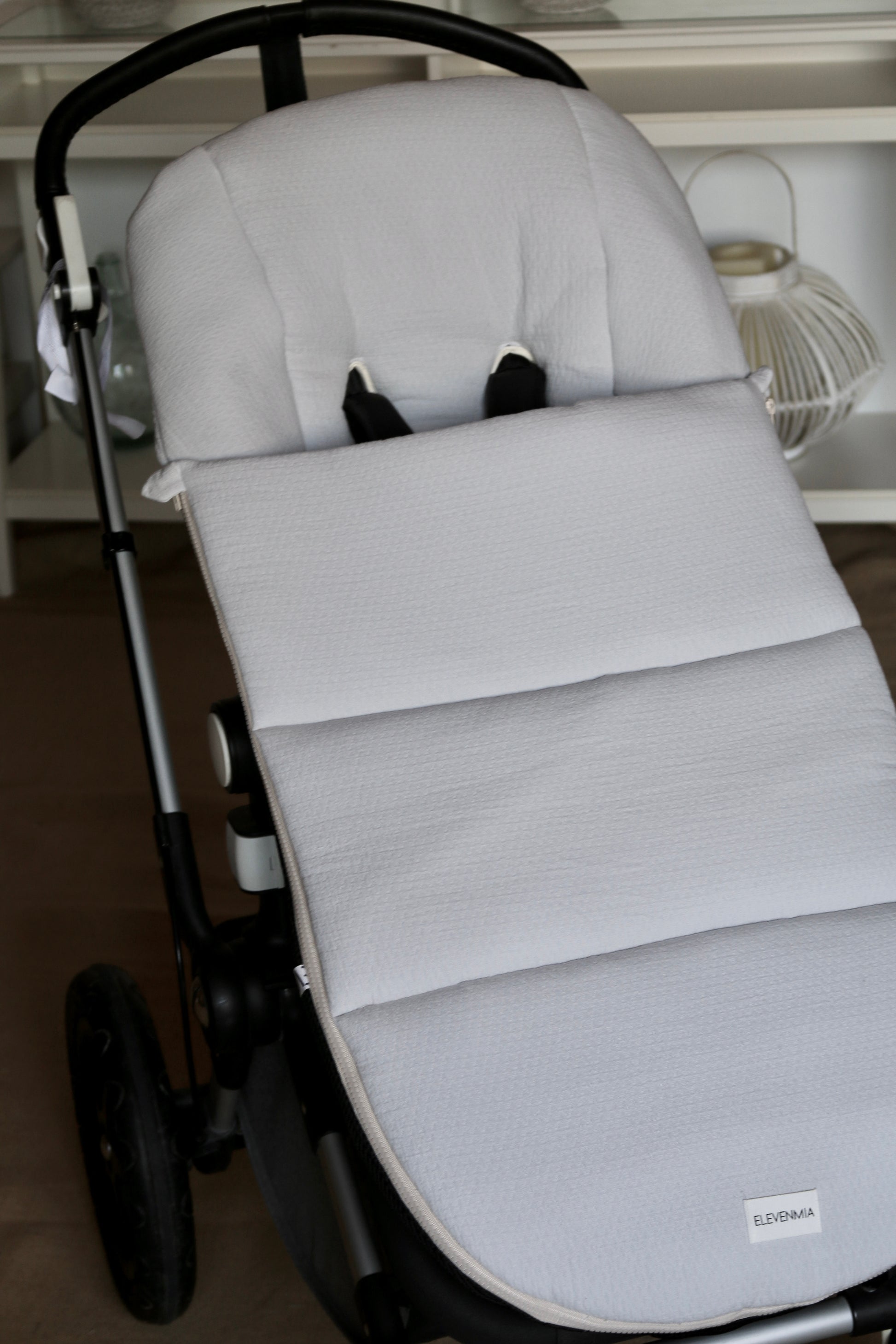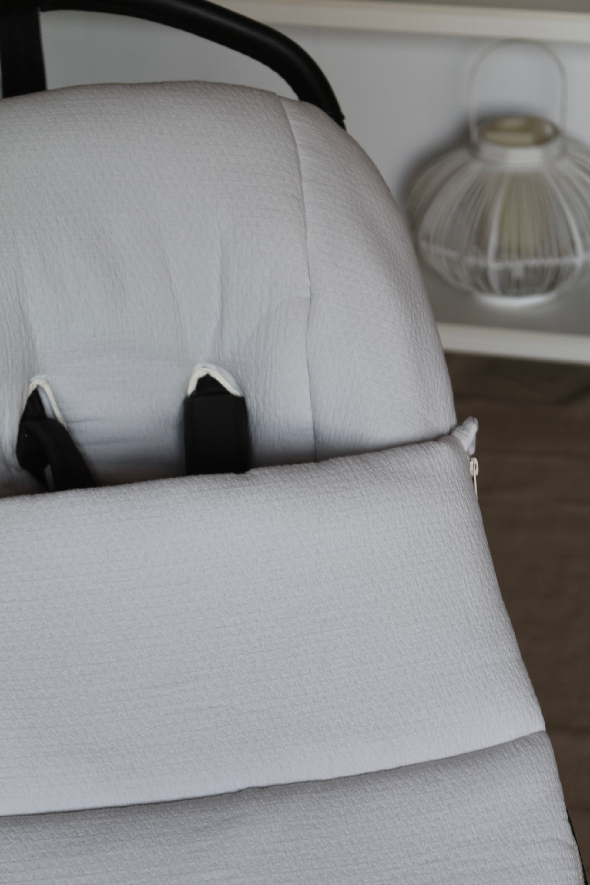 Rabat et sangles pour ajustement à l'arrière de la poussette et réglage au niveau des pieds.