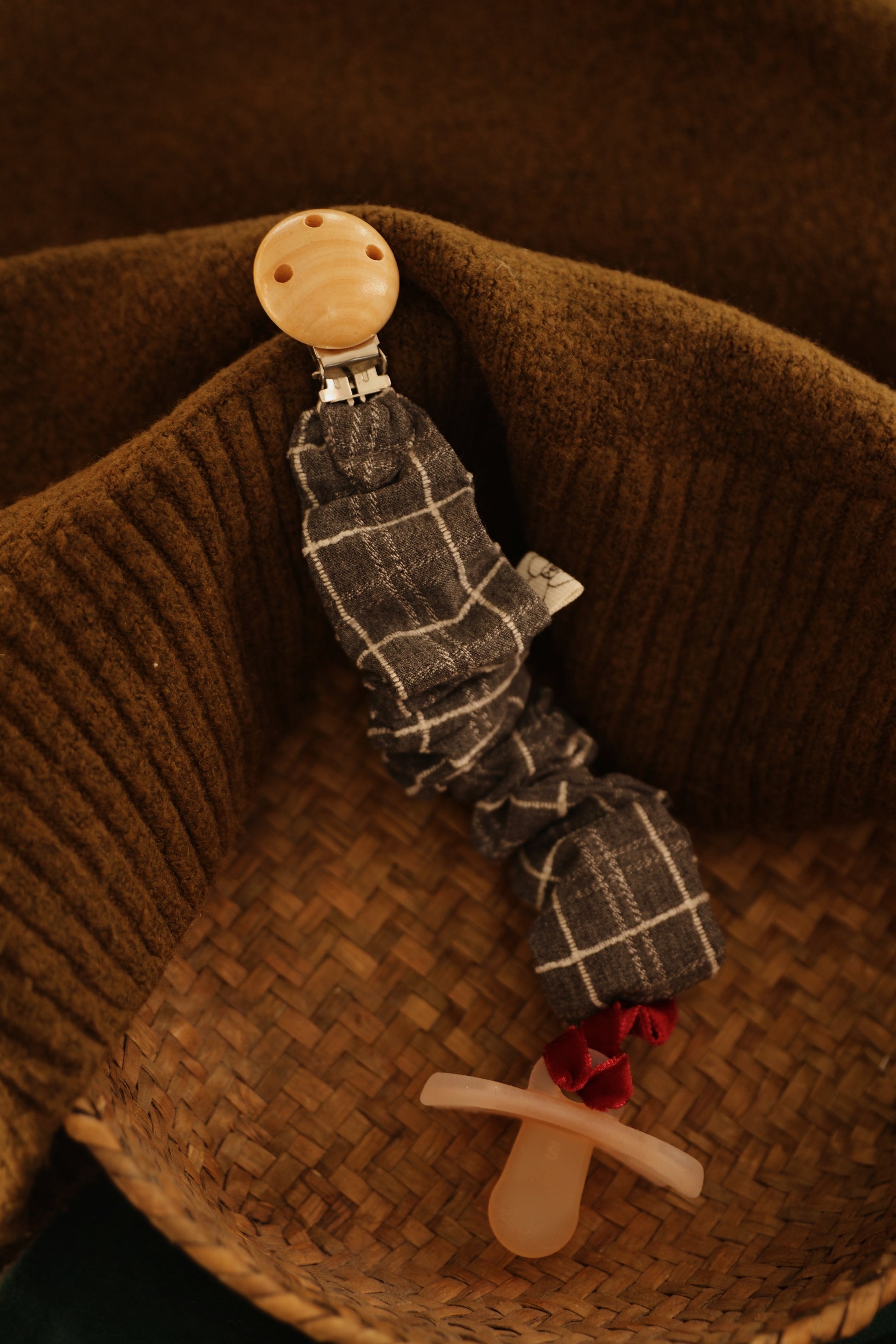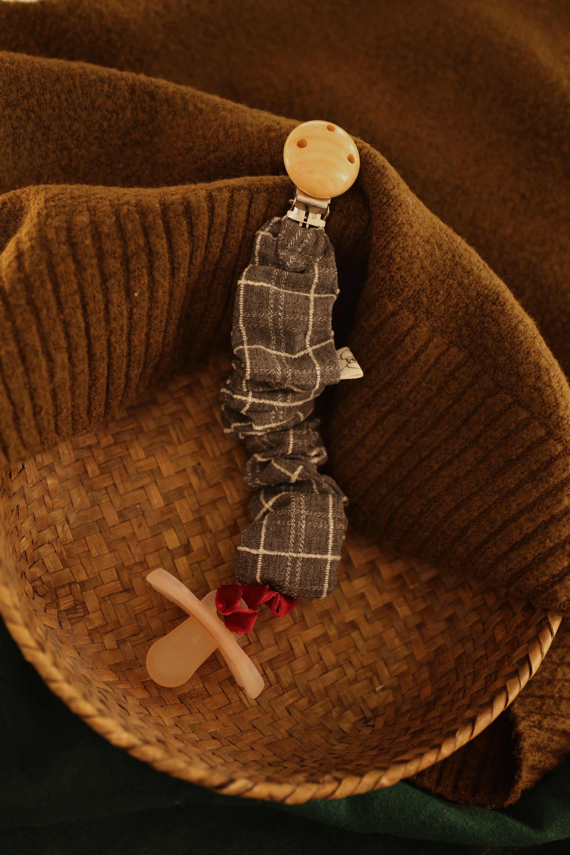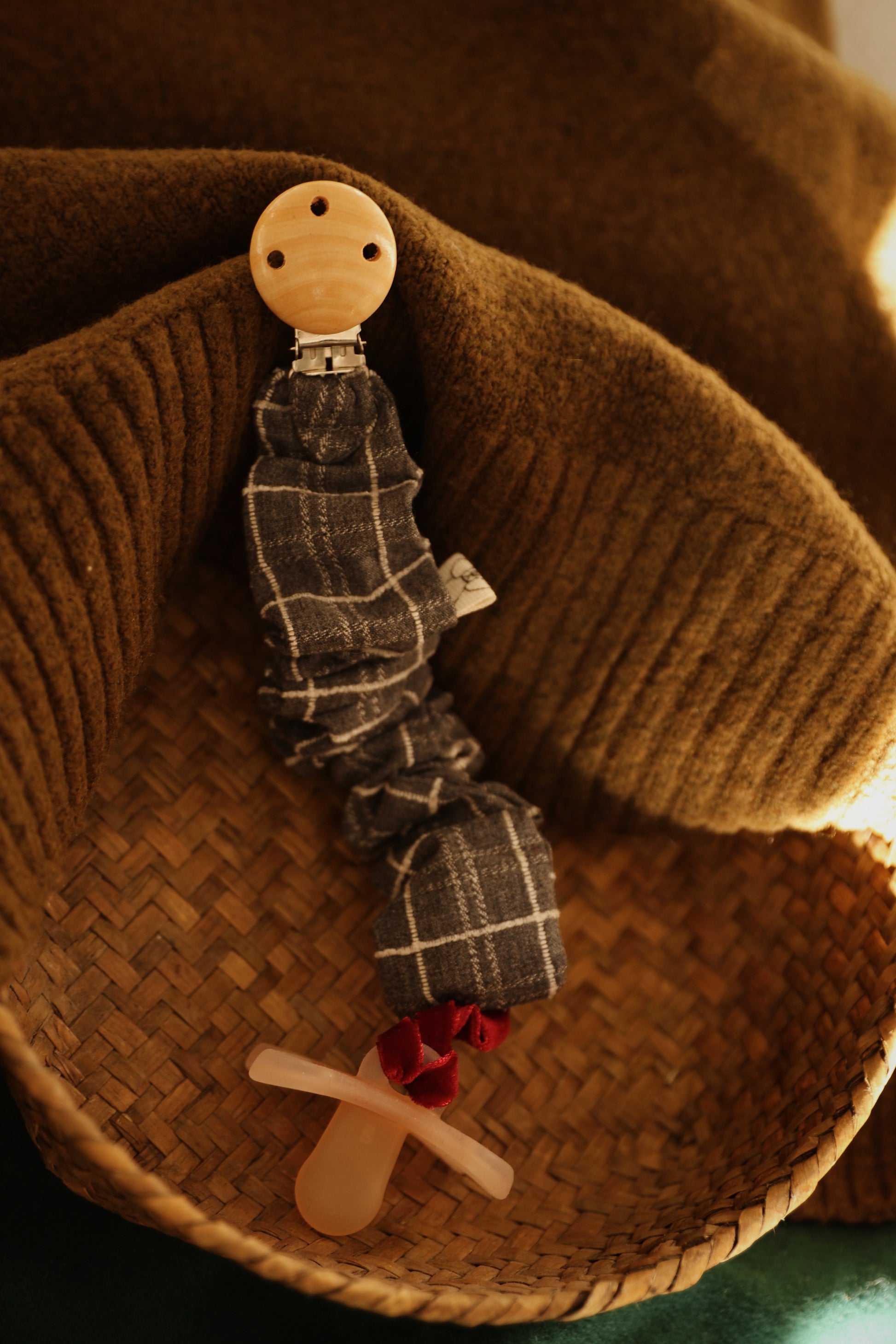 Accesorio para llevar el chupete. Terminación con cordón para poder anudar cualquier tipo de chupete.