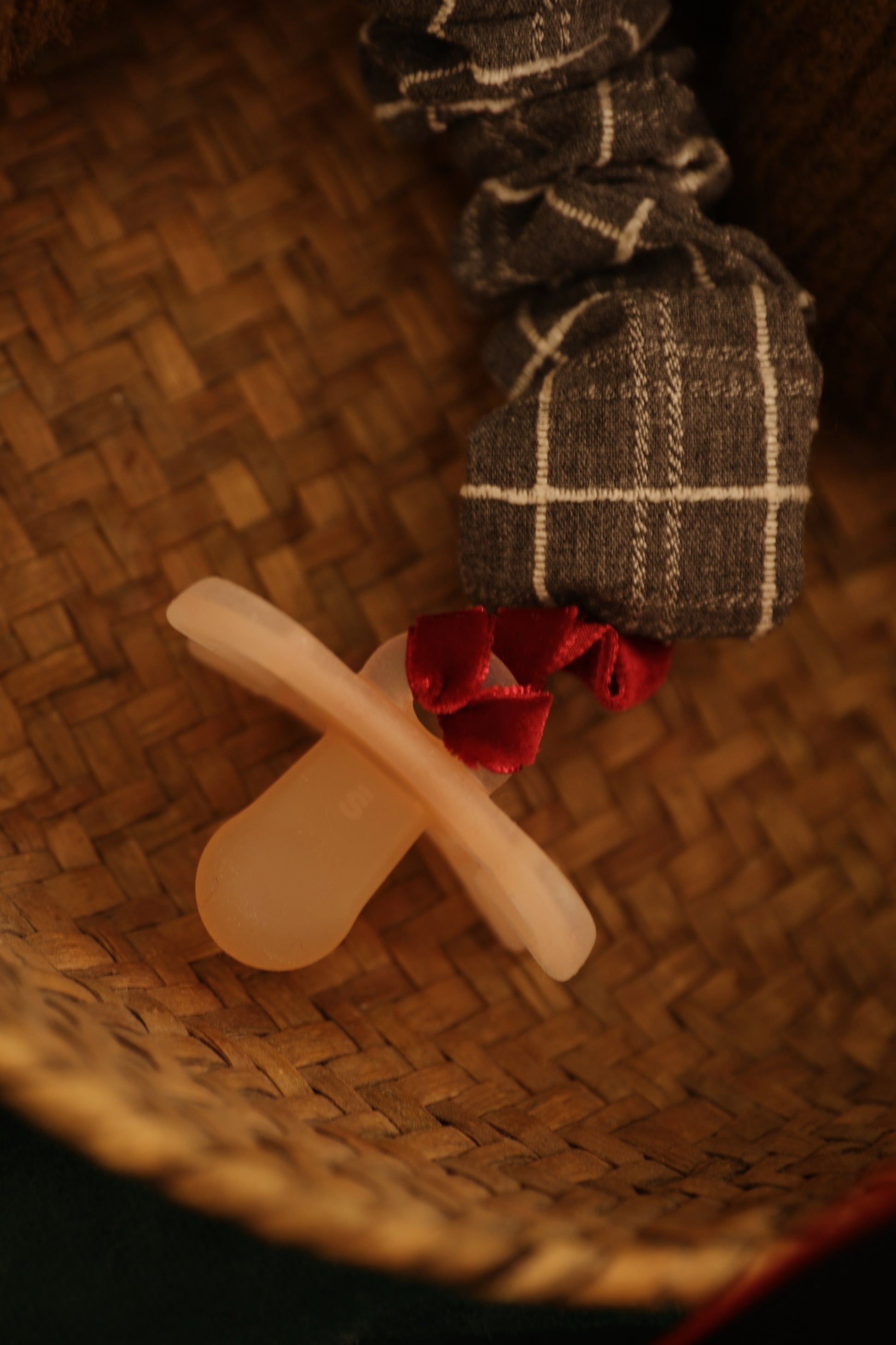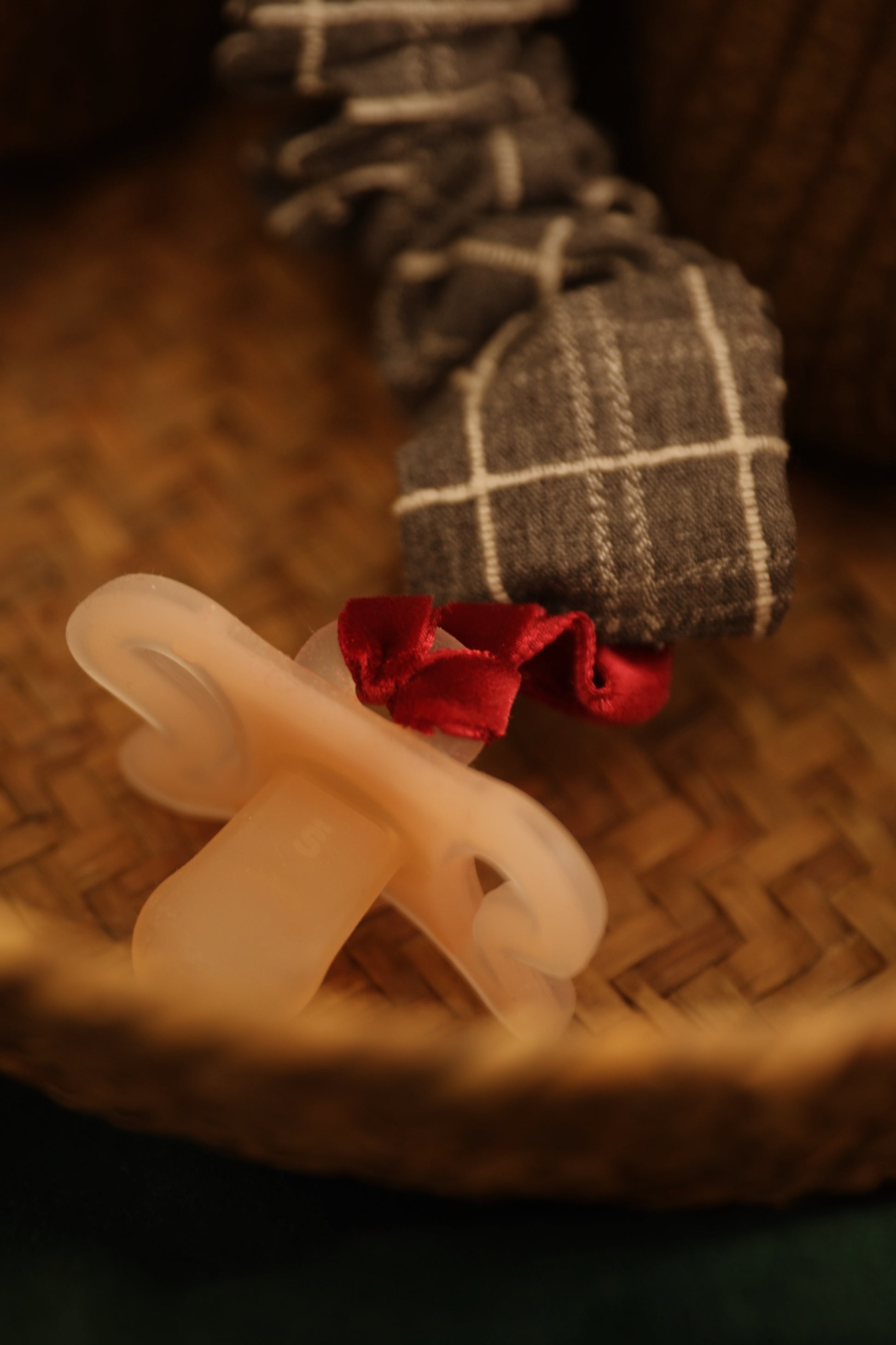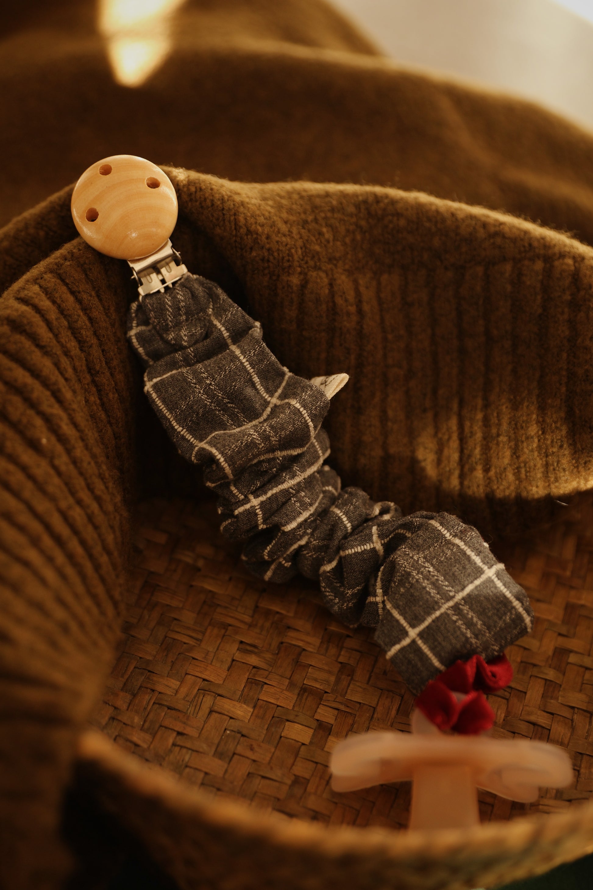 Accesorio para llevar el chupete. Terminación con cordón para poder anudar cualquier tipo de chupete.