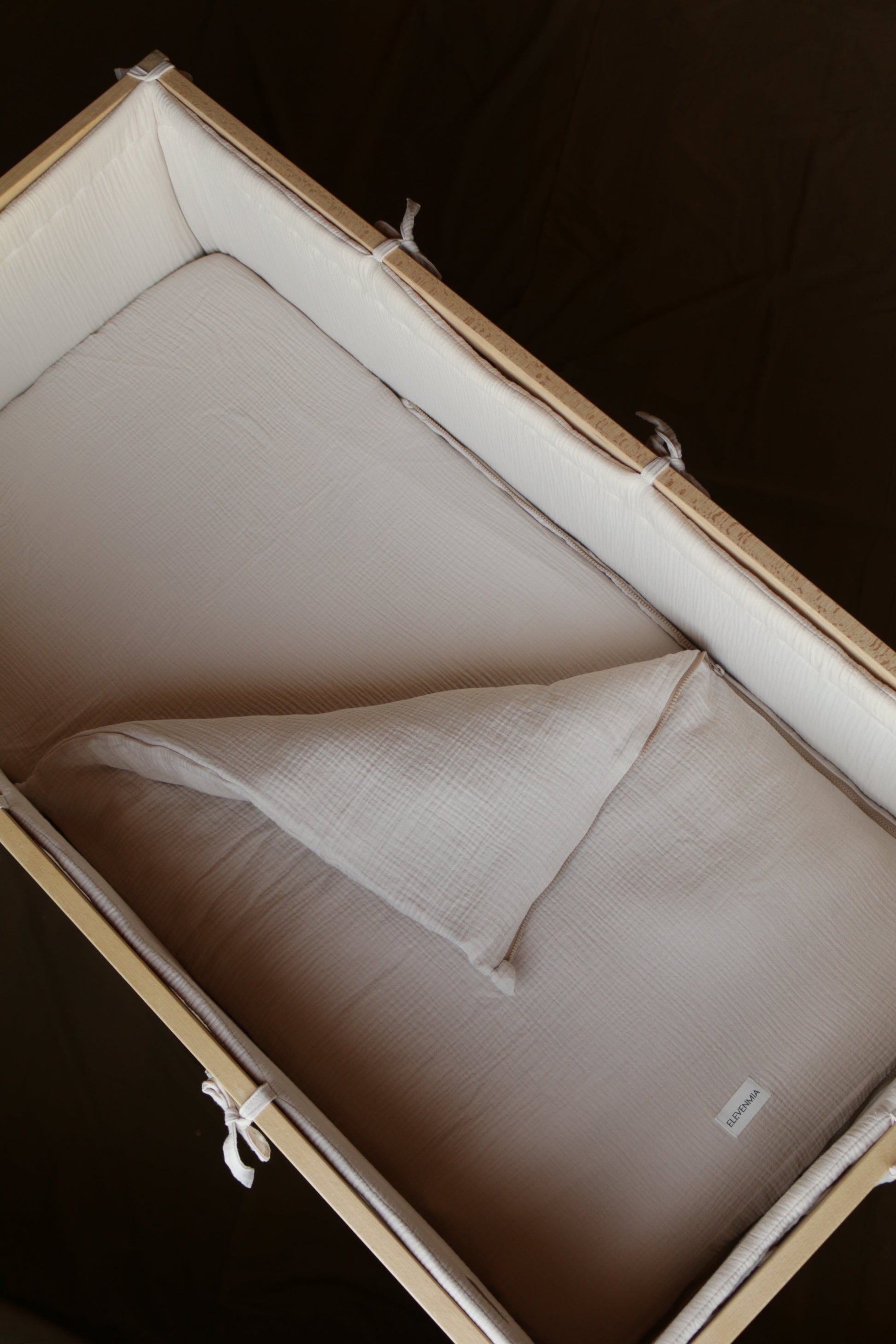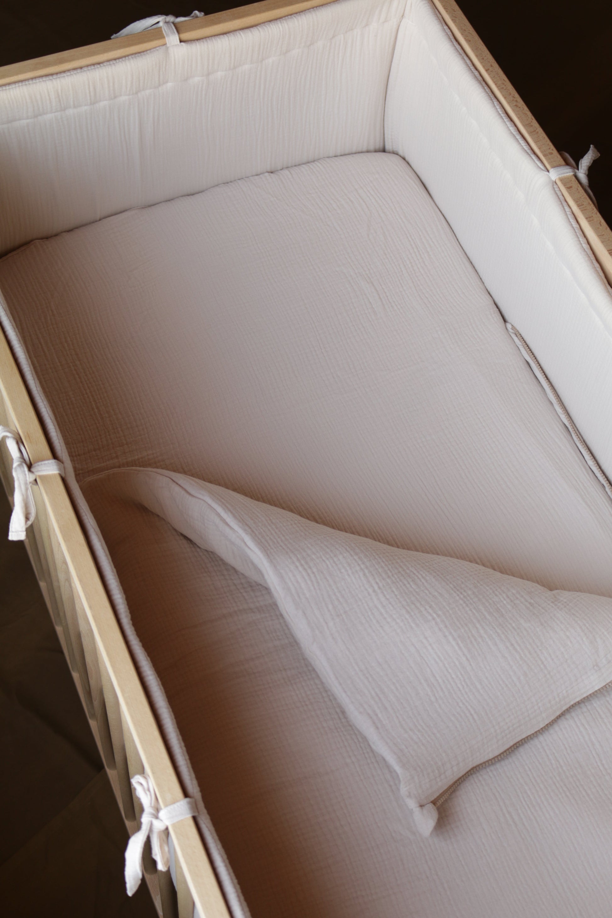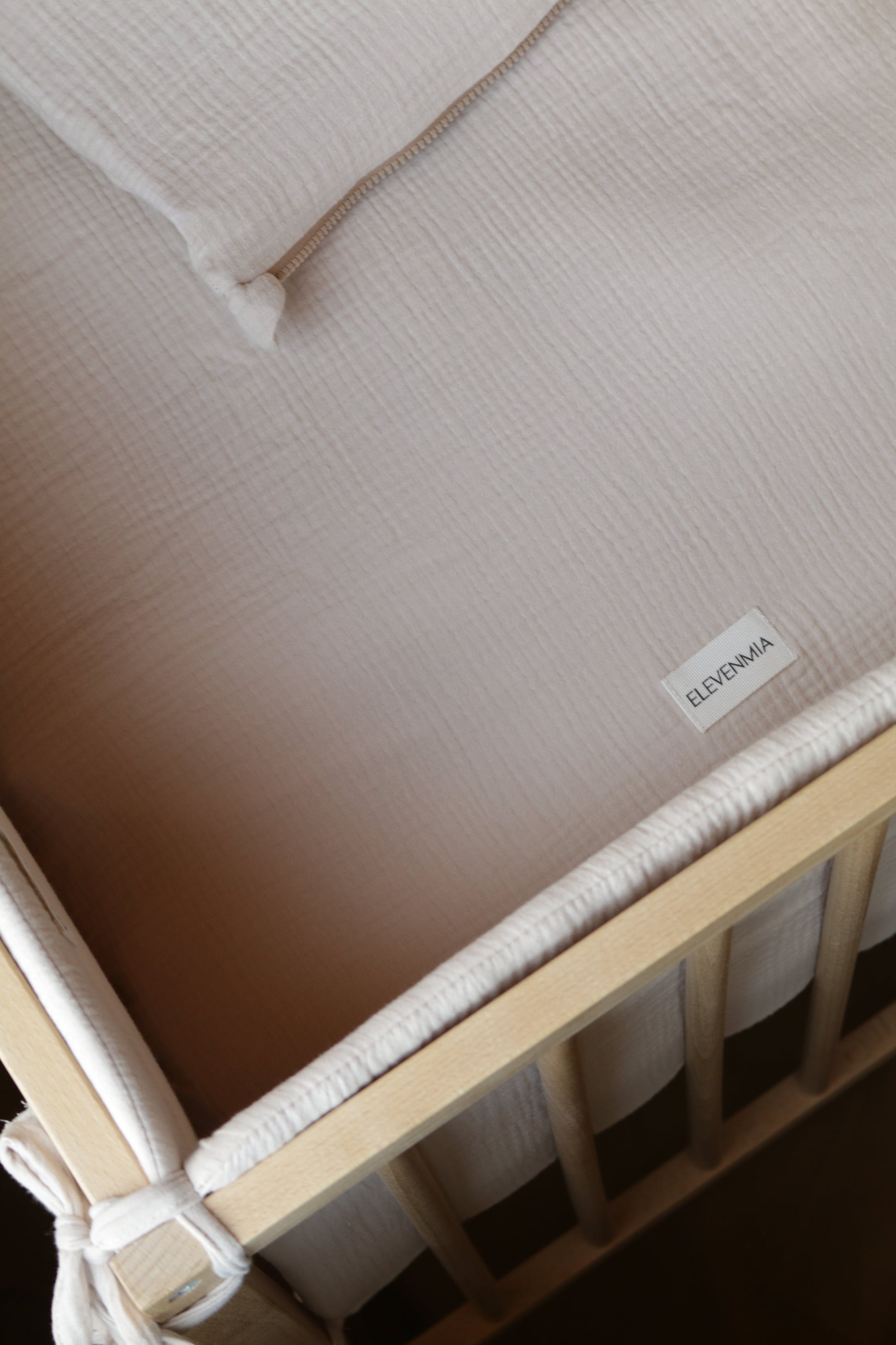 Diseñamos este protector de cuna, para evitar golpes y rozaduras entre los barrotes de la cuna y nuestro pequeño. Todas las costuras de este producto son interiores, evitando así, que existan problemas de roce o molestias a nuestro pequeño.