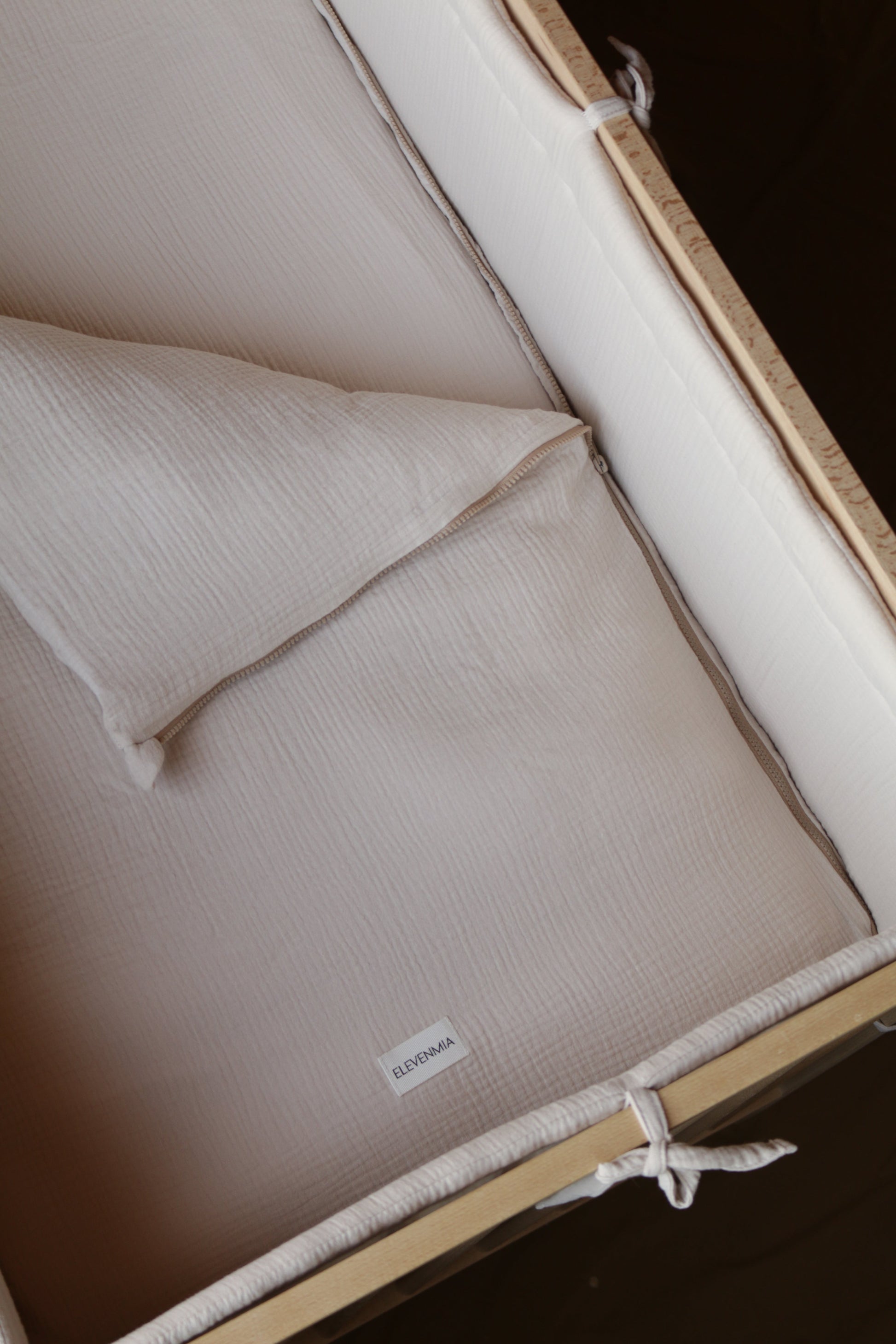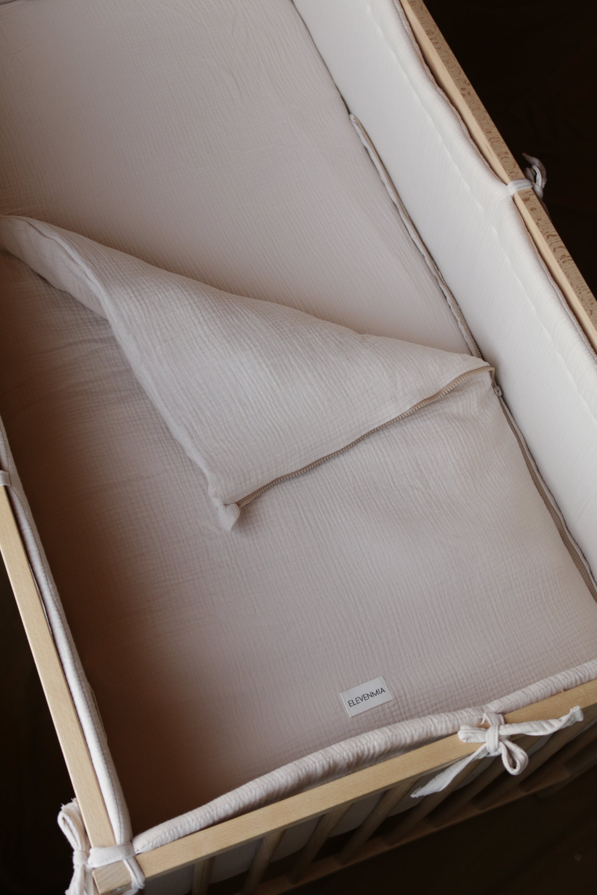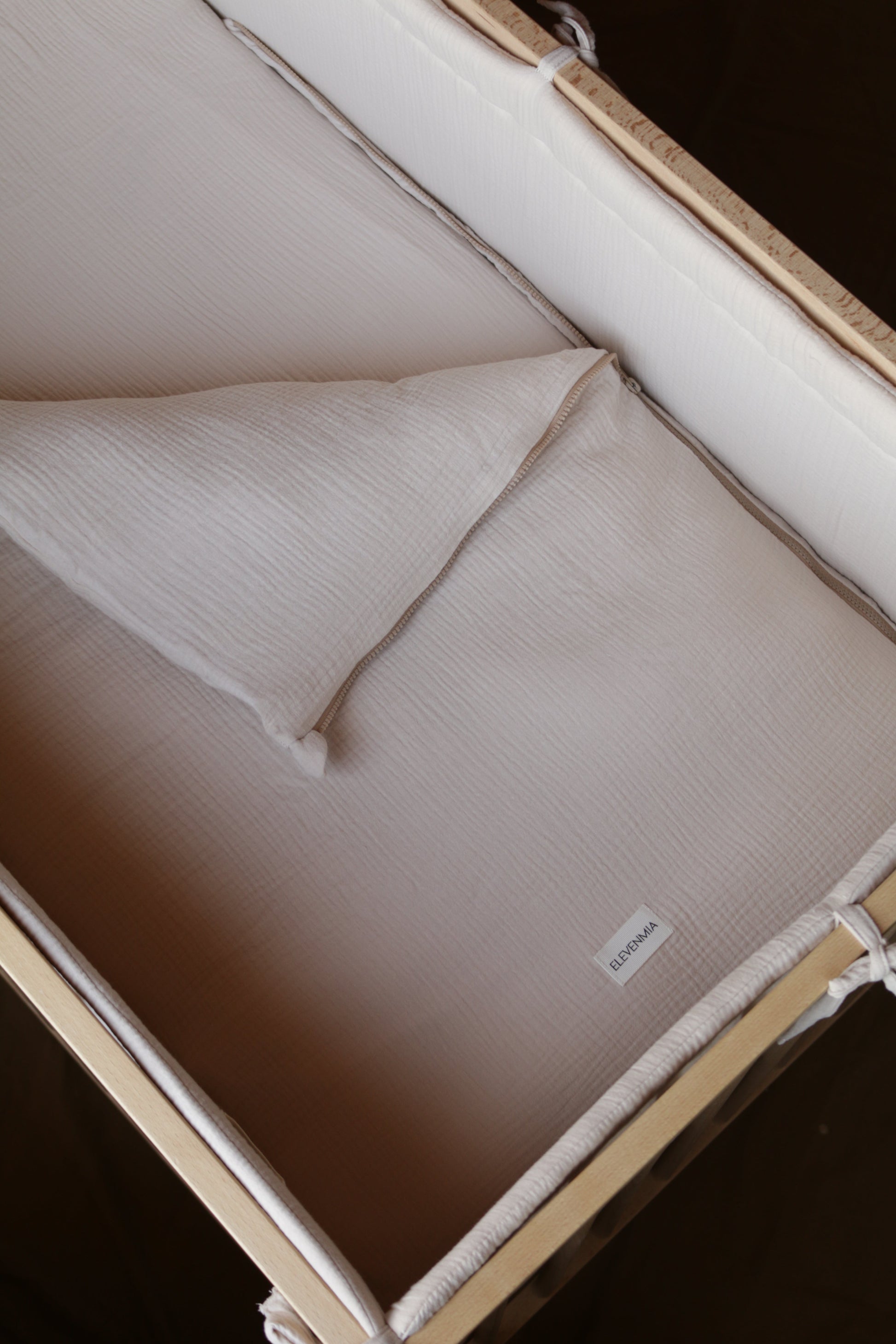 Diseñamos este protector de cuna, para evitar golpes y rozaduras entre los barrotes de la cuna y nuestro pequeño. Todas las costuras de este producto son interiores, evitando así, que existan problemas de roce o molestias a nuestro pequeño.