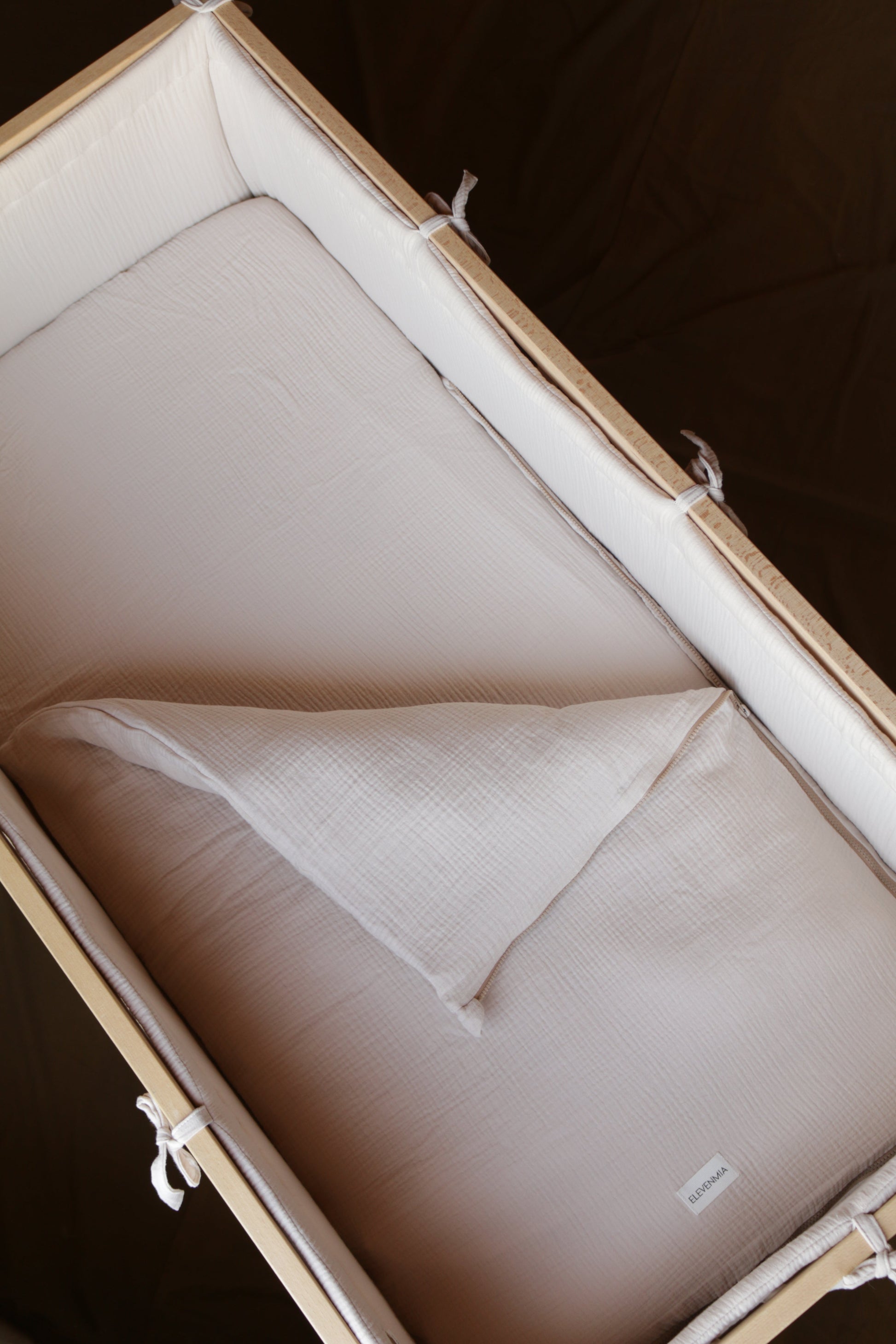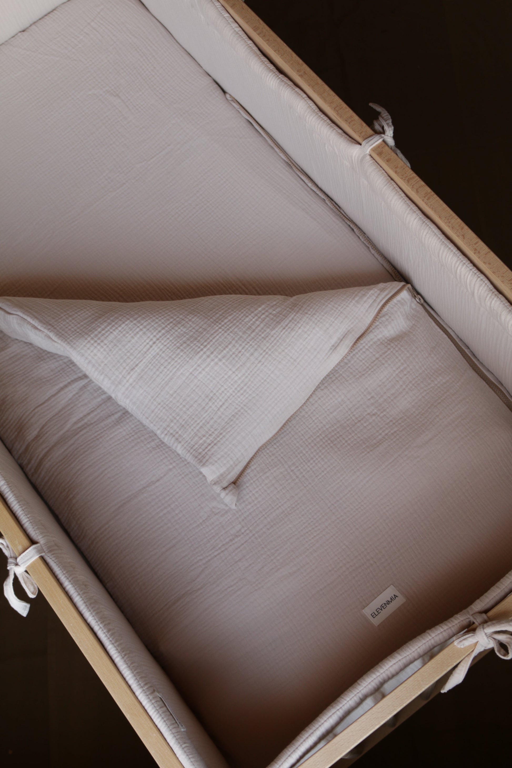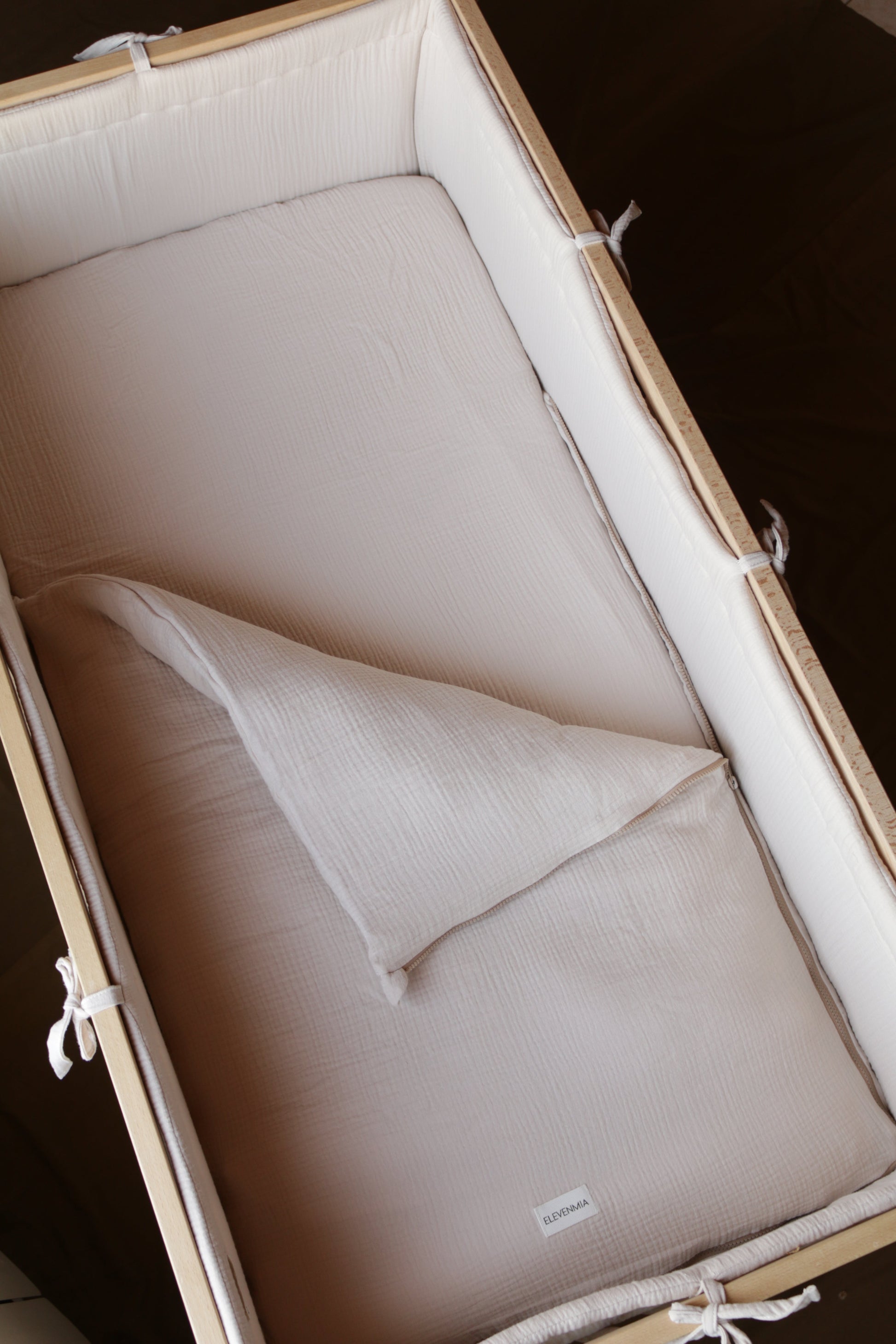 Con la cobertura total de la cuna en todo su perímetro, nos asegura, que si el bebe se mueve o gira, no se golpeará. Aporta un look acabado y protegido.