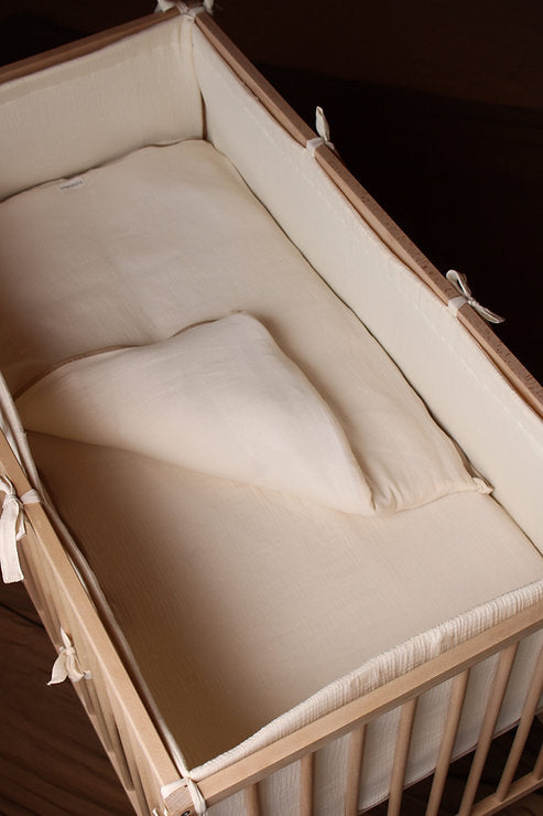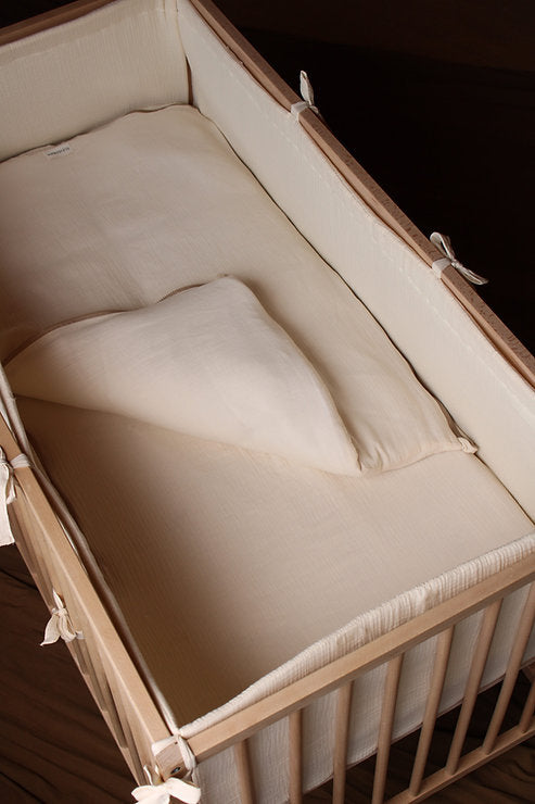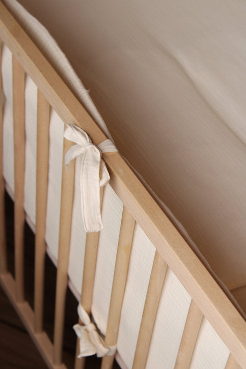 Diseñamos este protector de cuna, para evitar golpes y rozaduras entre los barrotes de la cuna y nuestro pequeño. Todas las costuras de este producto son interiores, evitando así, que existan problemas de roce o molestias a nuestro pequeño.