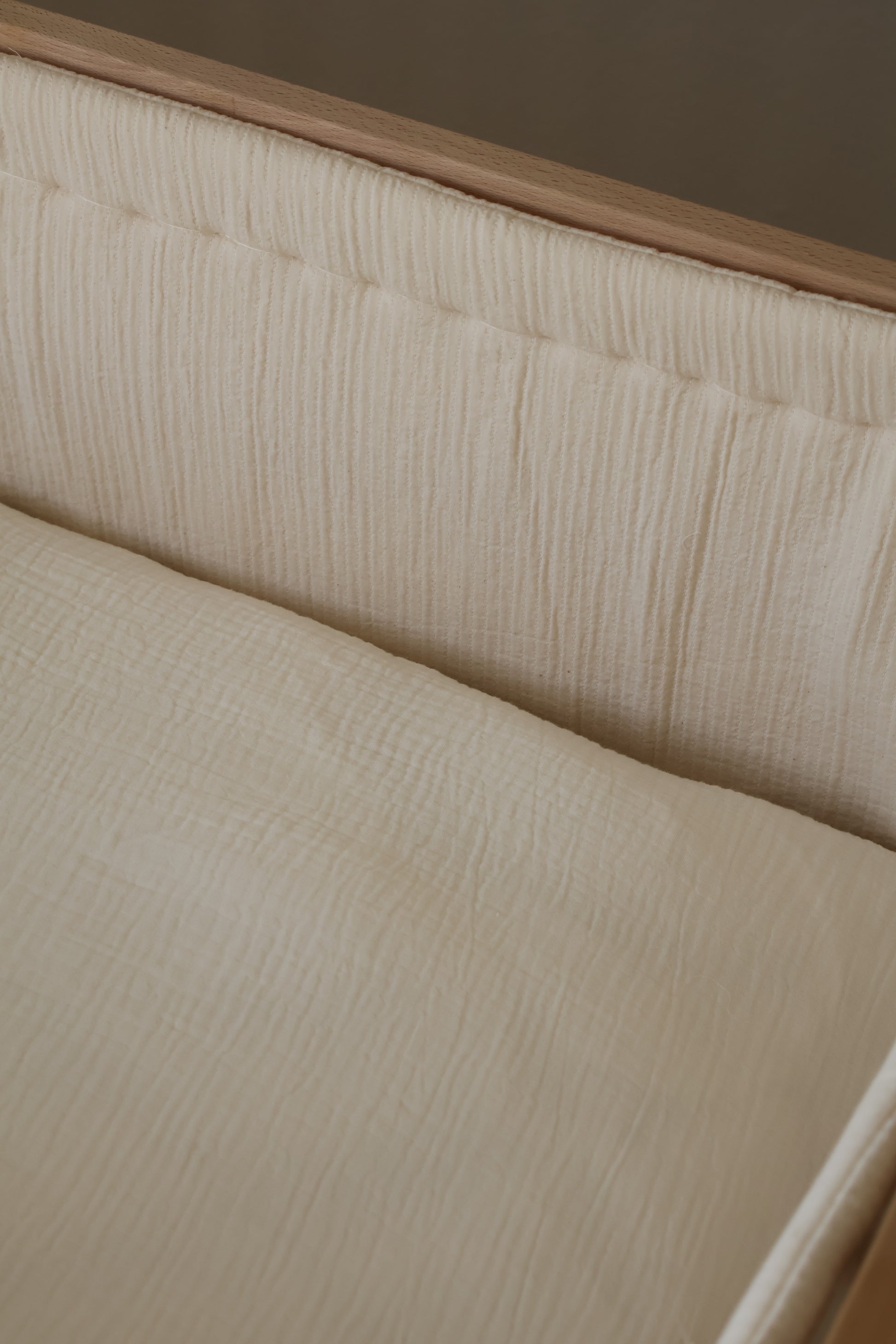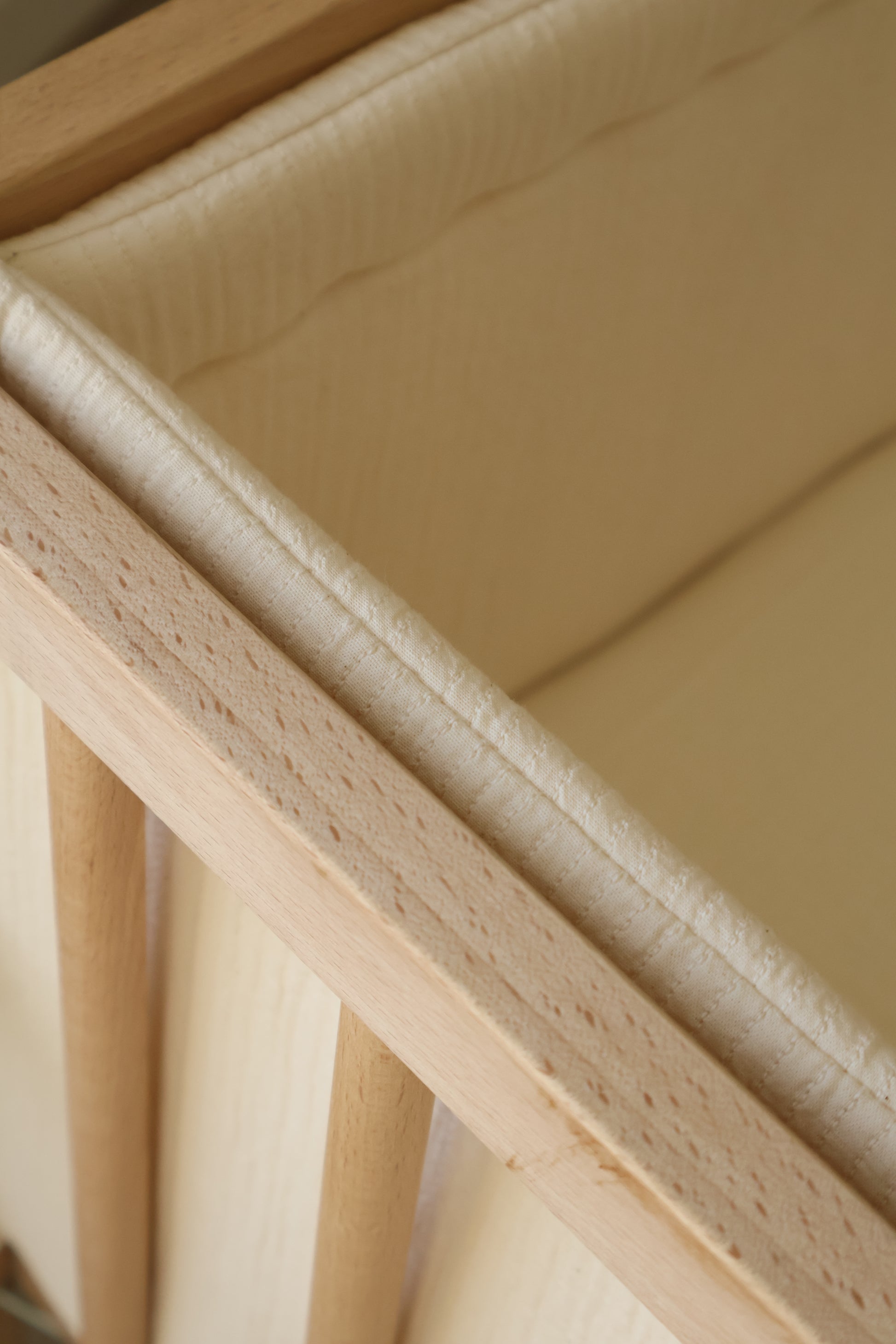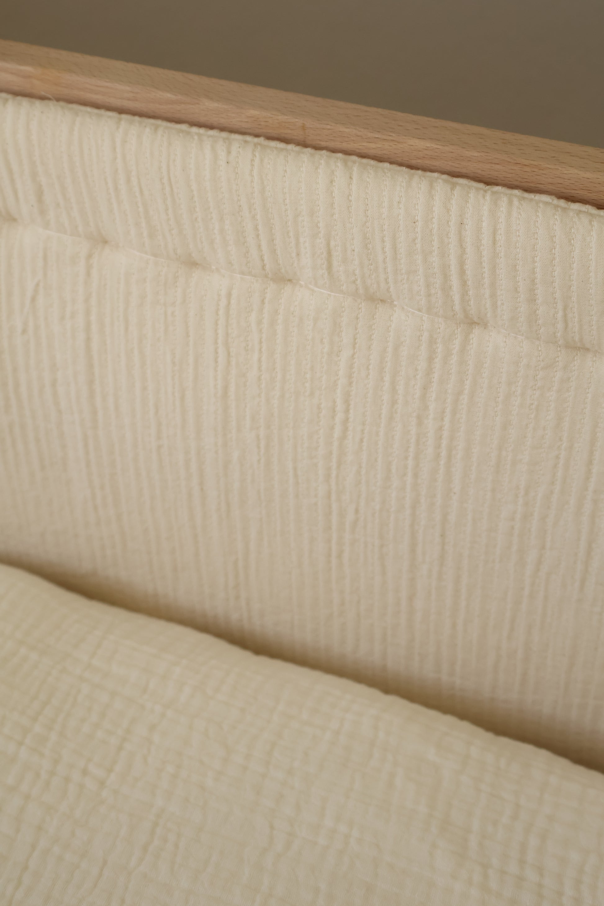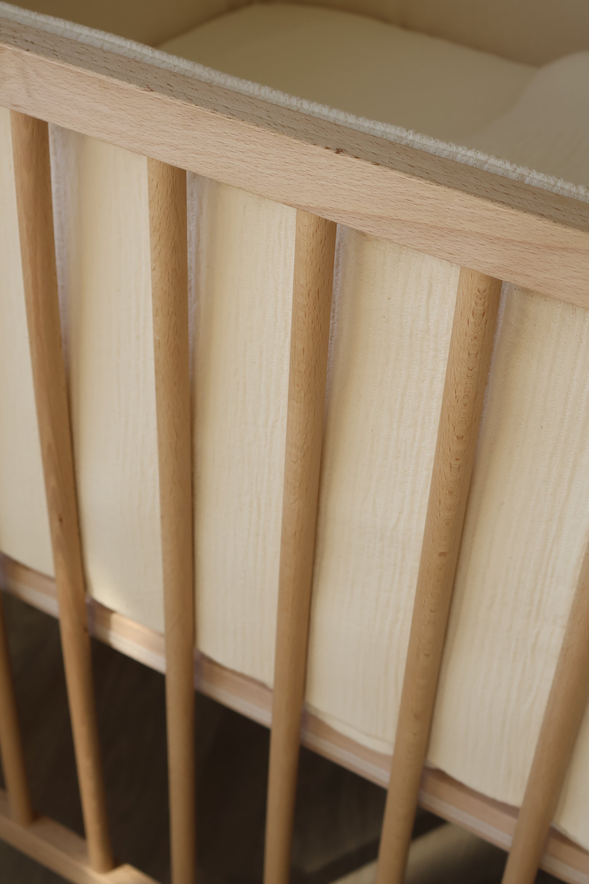 Diseñamos este protector de cuna, para evitar golpes y rozaduras entre los barrotes de la cuna y nuestro pequeño. Todas las costuras de este producto son interiores, evitando así, que existan problemas de roce o molestias a nuestro pequeño.