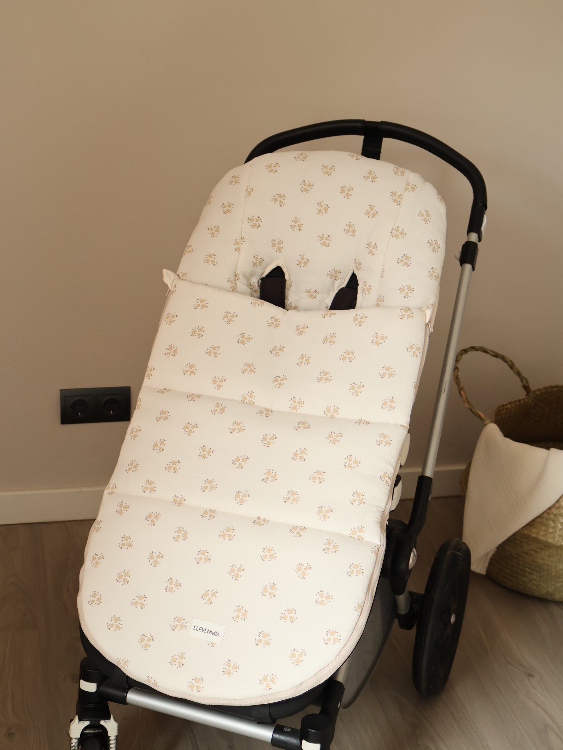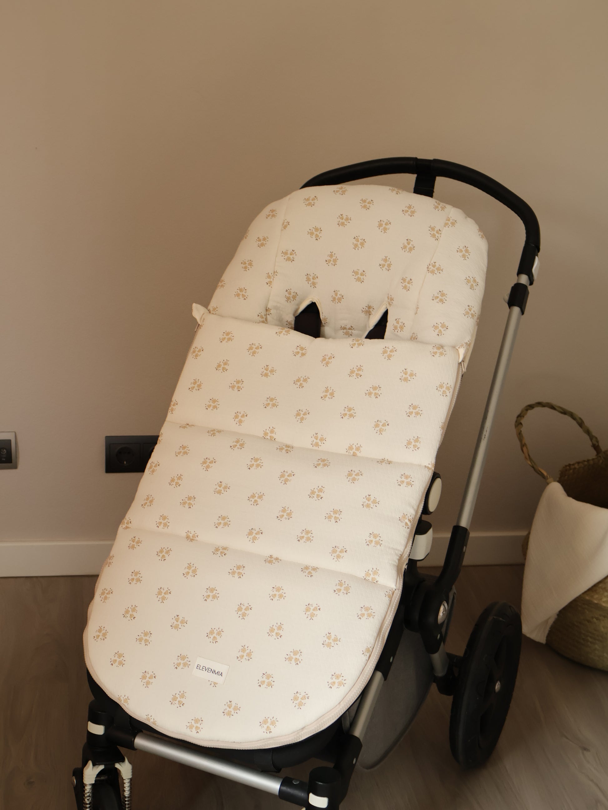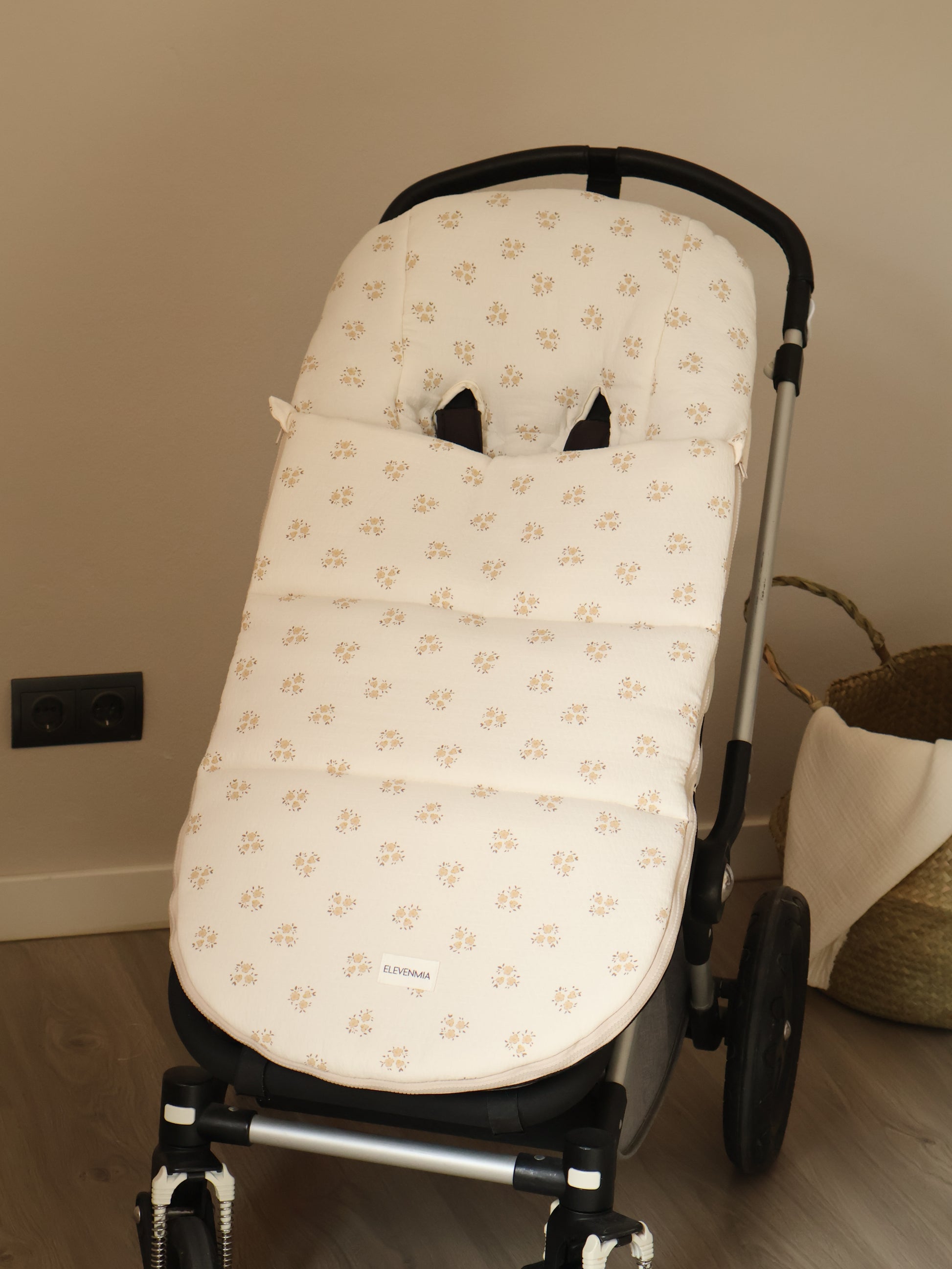 Solapa y tiras para ajuste al respaldo del cochecito y ajuste en la zona de los pies.